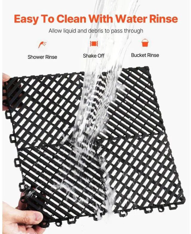 VEVOR Interlocking Drainage Mat, 12 x 12 Modular Interlocking Cushion Durable PP Material, 24 Pcs Splicing Drainage Mats, Non-Slip Drainage Floor Tile and Shower Mat, for Garage, Garden, Kitchen & Outdoor, Black Tough PP Material Extra Thickness for Reliability Snap-Together Setup Slip-Resistant Surface Versatile for Any Space Built to