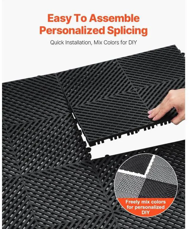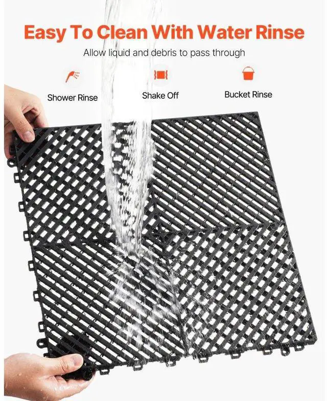 VEVOR Interlocking Drainage Mat, 15.7 x 15.7 Modular Interlocking Cushion Durable PP Material, 24 Pcs Splicing Drainage Mats, Non-Slip Drainage Floor Tile and Shower Mat, for Garage, Garden, Kitchen & Outdoor, Black Tough PP Material Extra Thickness for Reliability Snap-Together Setup Slip-Resistant Surface Versatile for Any Space Built to
