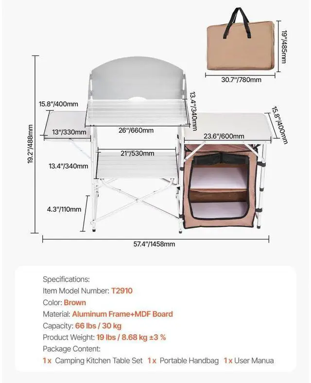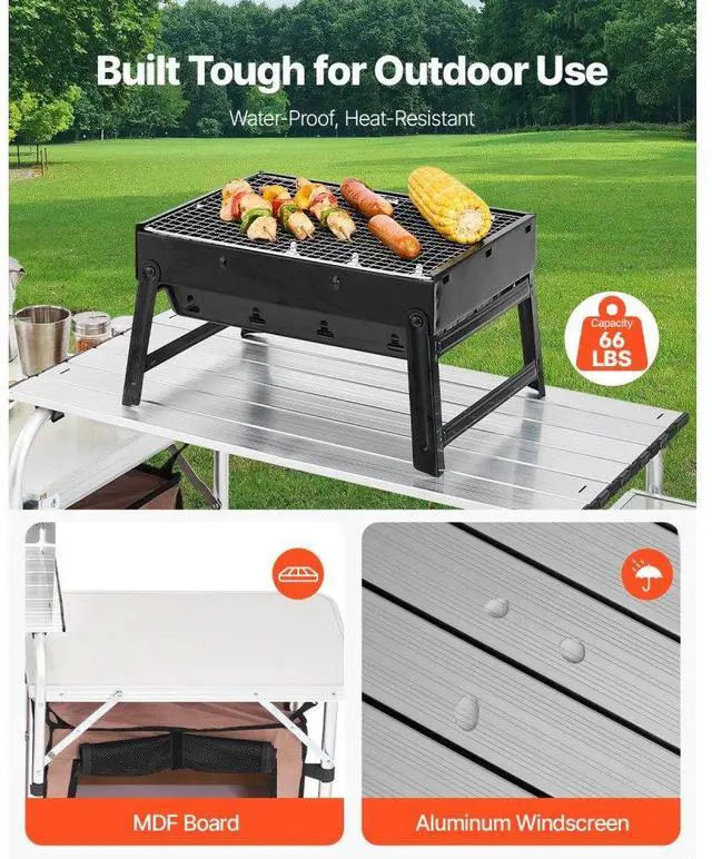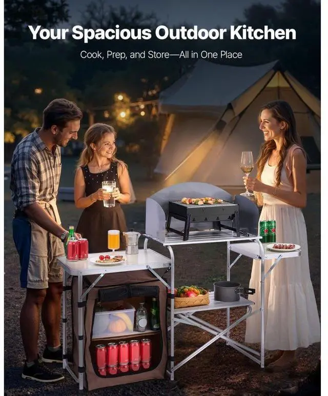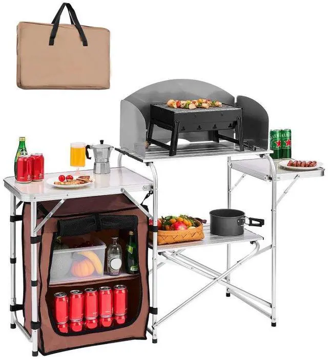 Camping Kitchen Table Picnic Cabinet Folding Cooking Storage Rack Portable Brown Spacious Space Easy Installation Premium Material Convenient Storage Considerate