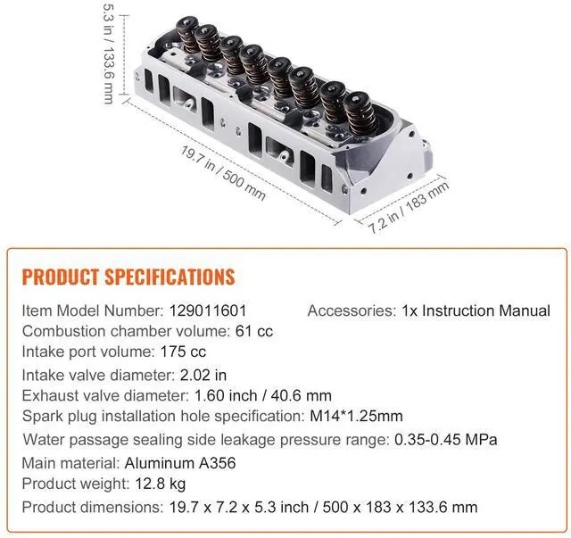 Intake Port Volume: 175 cc,Spark Plug Installation Hole Specification: M14*1.25mm,Combustion Chamber Volume: 61 cc,Spark Plug Type: Slant Hole,Item Model Number: 129011601,Product Weight: 26.0 lbs / 11.8 kg,Intake Valve Diameter: 2.0 inch / 51.3 mm,Water Passage Sealing Side Leakage Pressure Range: 0.35-0.45 MPa,Product Dimensions: 19.7x7.2x5.3 inch / 500x183x133.6 mm,Main Material: Aluminum A356,Exhaust Valve Diameter: 1.60 inch / 40.6 mm