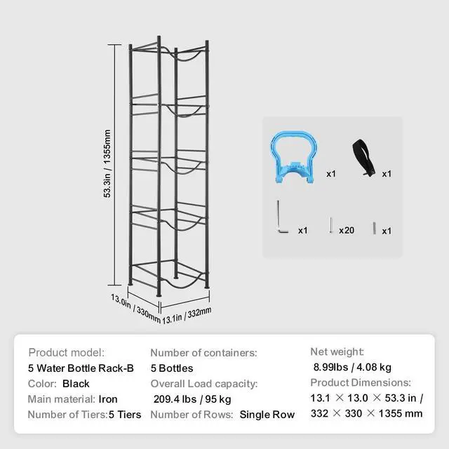 Primary Material: Iron,Number of Rows: Single Row,Capacity: 5 Bottles,Number of Tiers: 5 Tiers,Color: Black,Product Model: 5 Water Bottle Rack-B,Product Dimensions: 13.1 × 13.0 × 53.3 in / 332 × 330 × 1355 mm,Net Weight: 8.42 lbs / 3.82 kg,Overall Load Capacity: 209.4 lbs / 95 kg