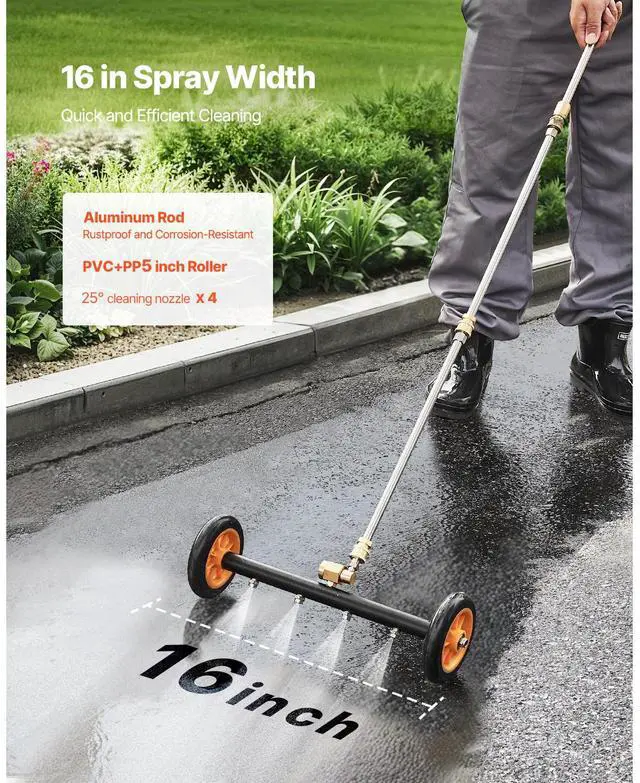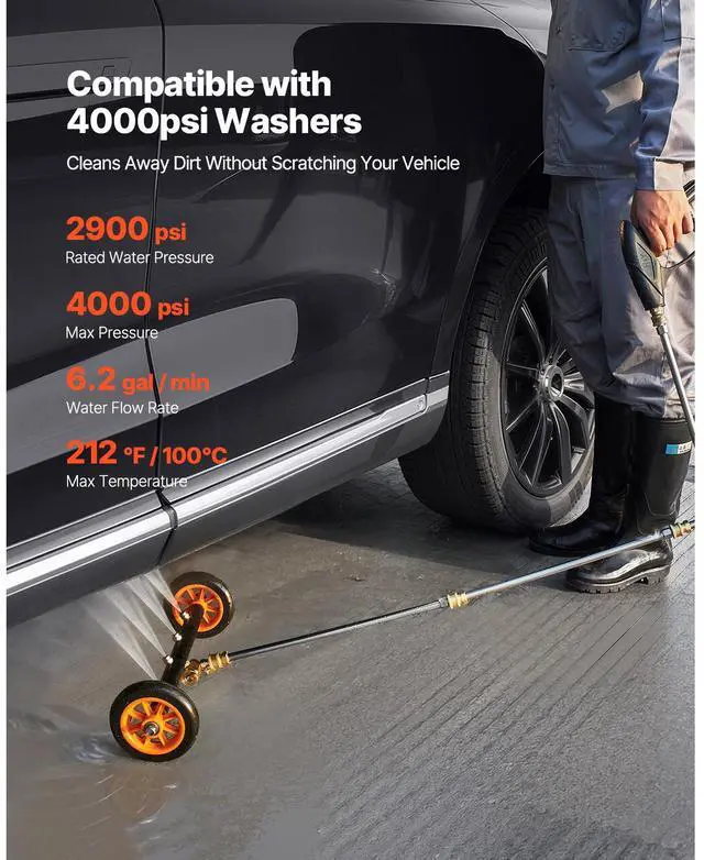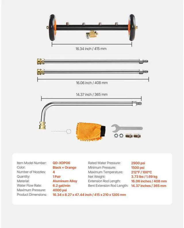 Number of Nozzles: 4,Color: Black + Orange,Material: Aluminum Alloy,Product Dimensions: 16.34 x 8.27 x 47.44 inch / 415 x 210 x 1205 mm,Maximum Temperature: 212 / 100,Extension Rod Length: 16.06 inches / 408 mm,Bent Extension Rod Length: 14.37 inches / 365 mm,Water Flow Rate: 6.2 gal/min,Item Model Number: QD-QXQ01,Minimum Pressure: 1500 psi,Net Weight: 3.73 lbs / 1.69 kg,Maximum Pressure: 4000 psi,Rated Water Pressure: 2900 psi