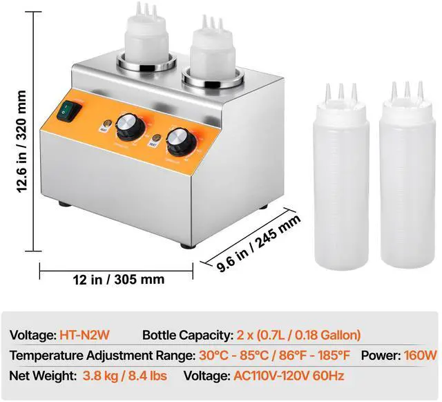 Temperature Adjustment Range: 30 - 85 / 86 - 185,Voltage: AC110V-120V 60Hz,Item Model Number: HT-N2W,Bottle Capacity: 2 x (0.7L / 0.18 Gallon),Water Tank Capacity2 x (0.8L / 0.21 Gallon):,Product Size (with Bottle): 305 x 245 x 320 mm / 12.0 x 9.6 x 12.6 in,Net Weight: 3.8 kg / 8.4 lbs,Power: 160W,Main Material: Stainless Steel