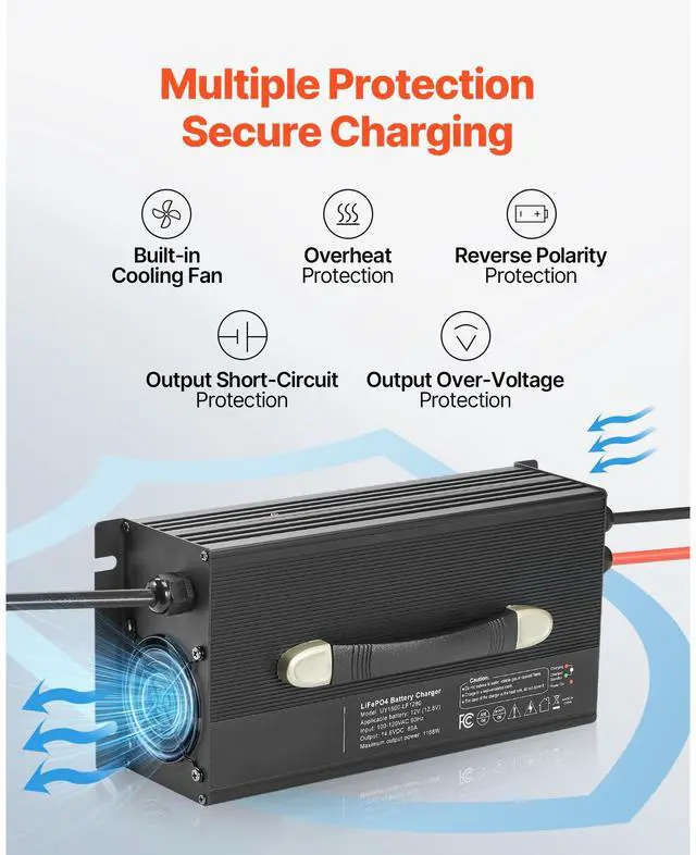 Charging Current: 60A,Item Model Number: UY1500-LF1260,Compatible Battery: 12V (12.8V) LiFePO4,Input Voltage/Frequency: 100-120V AC/60Hz,Main Material: Aluminum Alloy,Max Output Power: 876W,Charging Voltage: 14.6V DC
