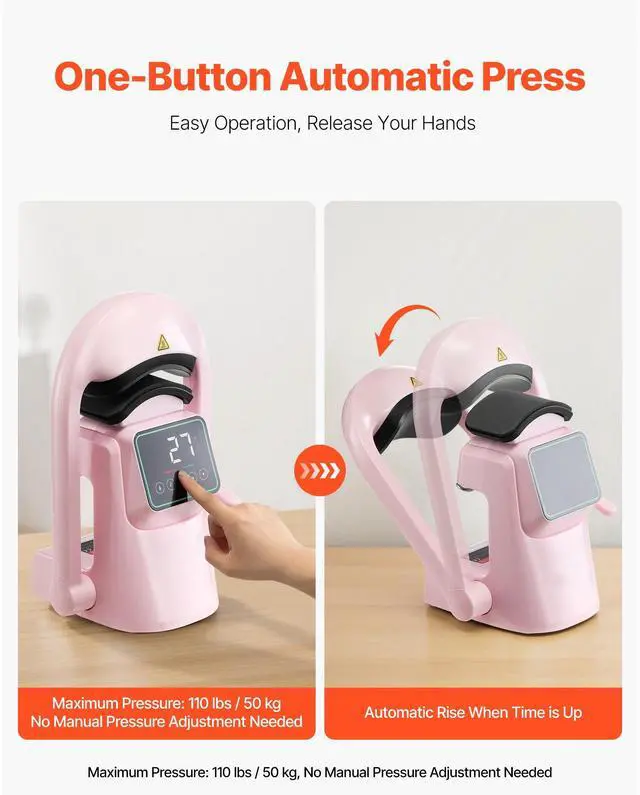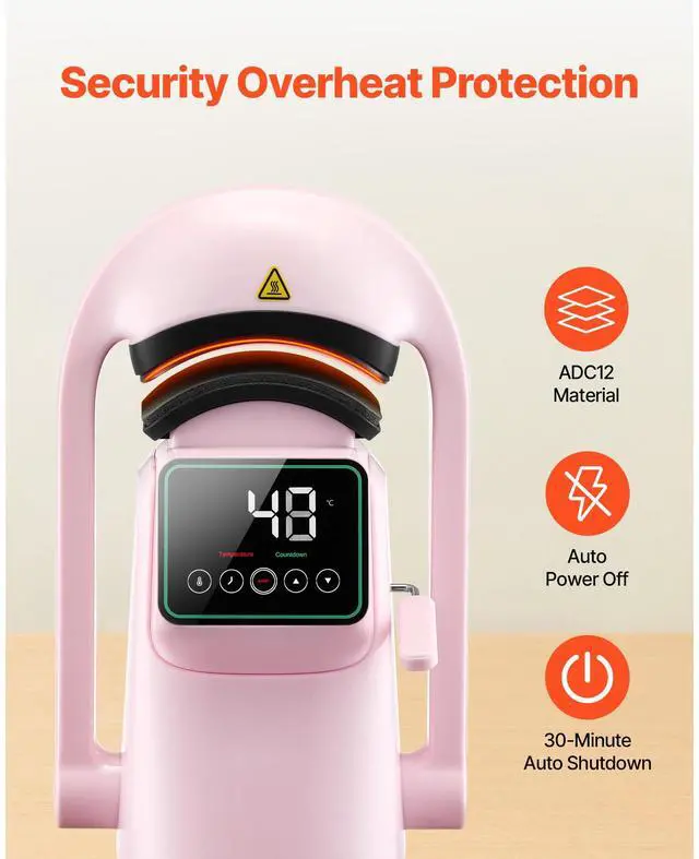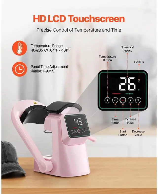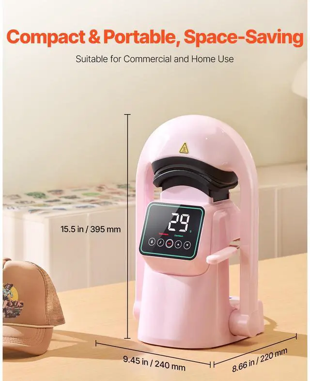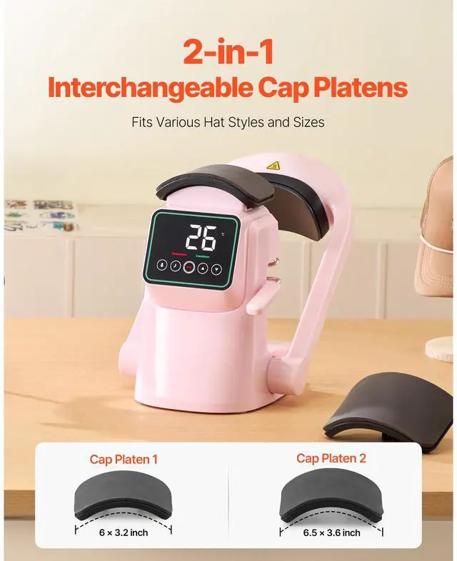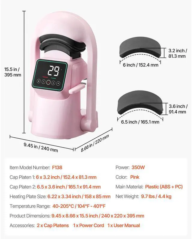 Cap Platen 2: 6.5 x 3.6 inch / 165.1 x 91.4 mm,Heating Plate Size: 6 x 3.54 inch / 152.4 x 89.9 mm,Color: Pink,Item Model Number: F138,Temperature Range: 40-205 / 104 - 401,Cap Platen 1: 6 x 3.2 inch / 152.4 x 81.3 mm,Product Dimensions: 9.45 x 8.66 x 15.5 inch / 240 x 220 x 395 mm,Net Weight: 9.92 lbs / 4.5 kg,Power: 350W,Main Material: Plastic (ABS + PC)