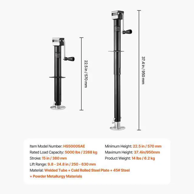 Stroke: 15 in / 380 mm,Rated Load Capacity: 5000 lbs / 2268 kg,Item Model Number: HS5000SAE,Product Weight: 14 lbs / 6.2 kg,Maximum Height: 47.2 in / 1200 mm,Material: Welded Tube + Cold Rolled Steel Plate + 45# Steel + Powder Metallurgy Materials,Lift Range: 9.8 - 24.8 in / 250 - 630 mm,Minimum Height: 22.5 in / 570 mm