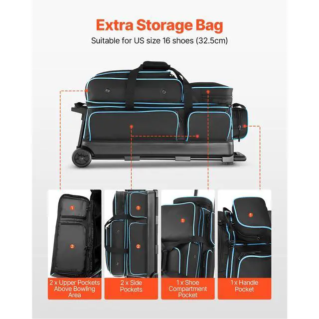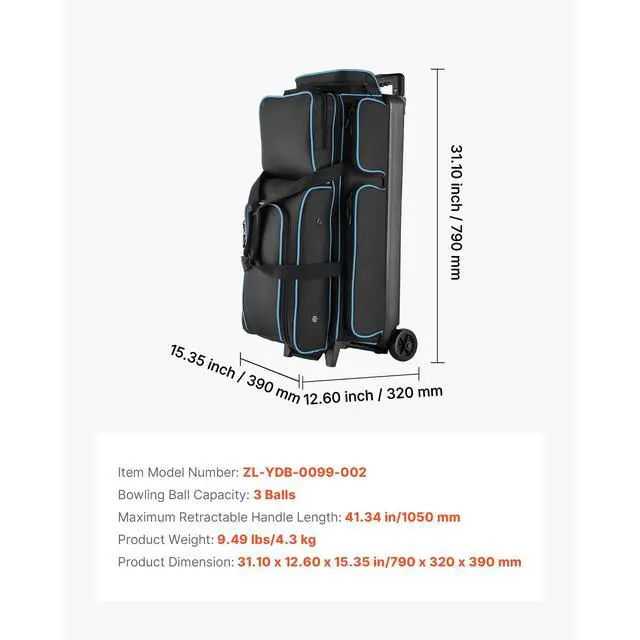 Product Dimension31.10 x 12.60 x 15.35 in/790 x 320 x 390 mm:,Product Weight9.49 lbs/4.3 kg:,Bowling Ball Capacity: 3 Balls,Maximum Retractable Handle Length: 41.34 in/1050 mm,Item Model NumberZL-YDB-0099-002: