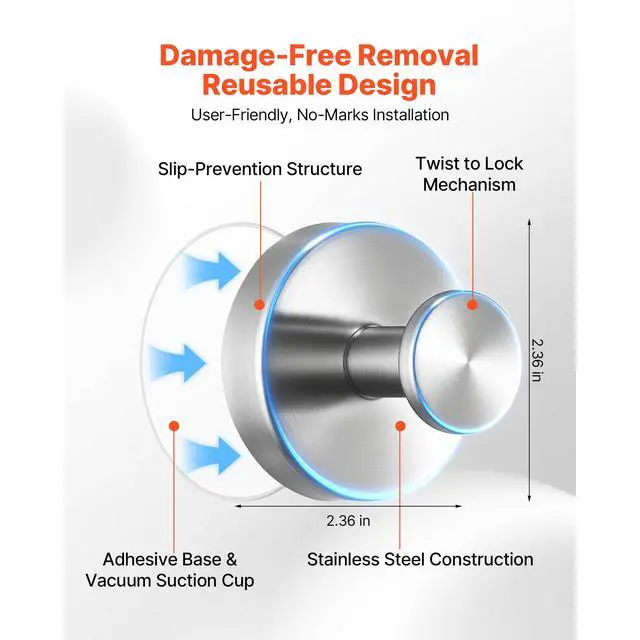Suction Cup Hooks for Shower No Drill Stainless Steel 2-Pack Towel Hooks