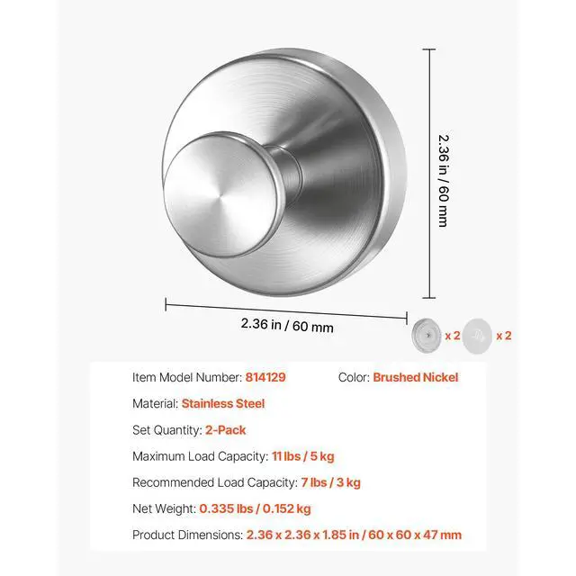Set Quantity: 2-Pack,Color: Brushed Nickel,Recommended Load Capacity: 7 lbs / 3 kg,Item Model Number: 814129,Maximum Load Capacity: 11 lbs / 5 kg,Material: Stainless Steel,Product Dimensions: 2.36 x 2.36 x 1.85 in / 60 x 60 x 47 mm,Net Weight: 0.335 lbs / 0.152 kg