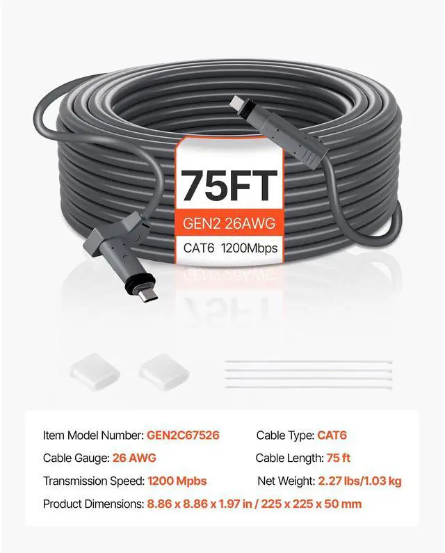 Cable Gauge: 26 AWG,Cable Type: CAT6,Item Model Number: GEN2C67526,Cable Length: 75 ft/22.86 m,Product Dimensions: 8.07 x 8.07 x 1.97 in/205 x 205 x 50 mm,Net Weight: 2.27 lbs/1.03 kg,Main Material: PVC + Copper,Transmission Speed: 1200 Mpbs