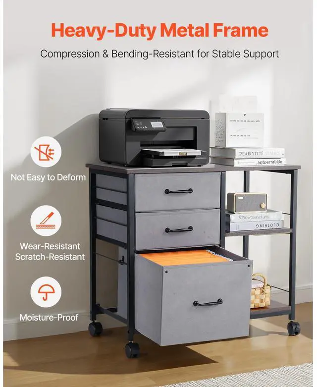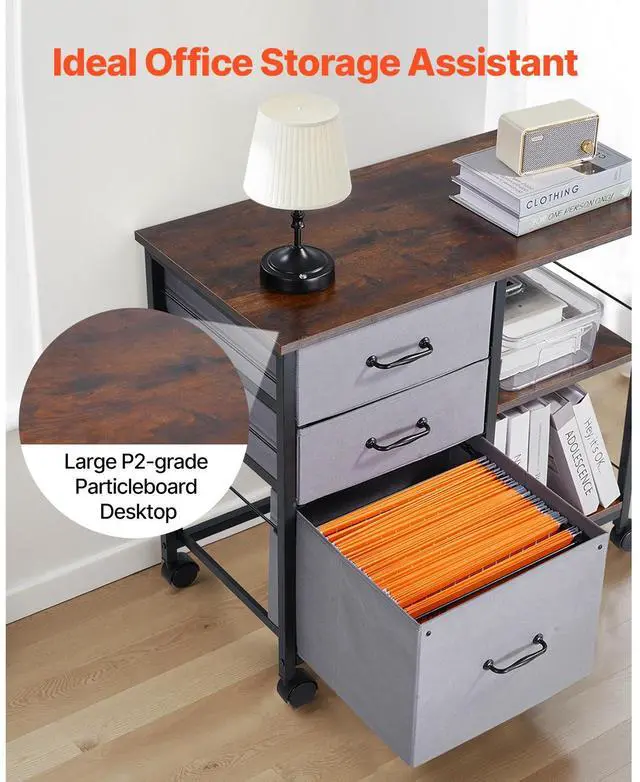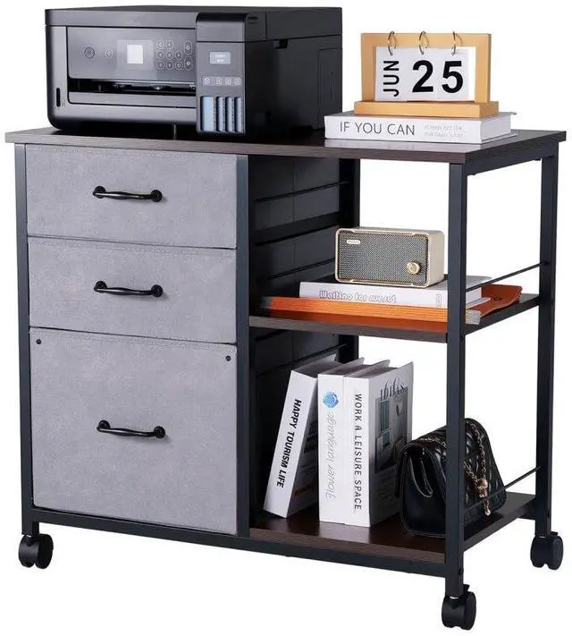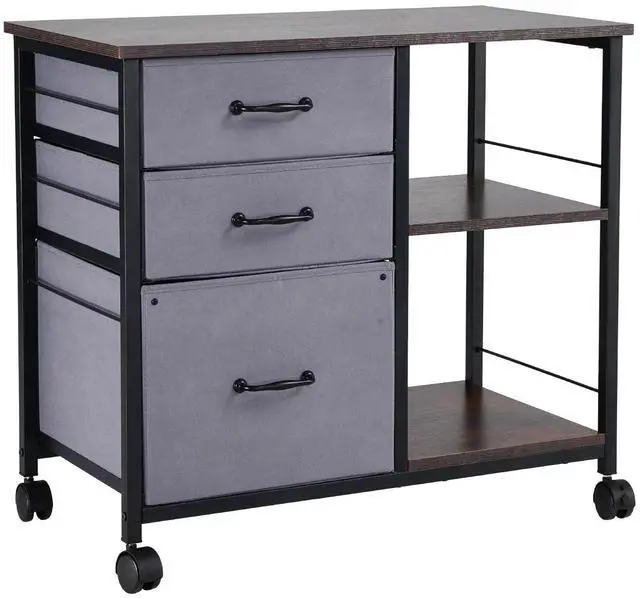 Mobile Metal File Cabinet with 3 Fabric Drawers and 2 Open Shelves Brown