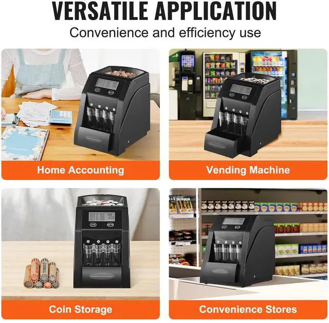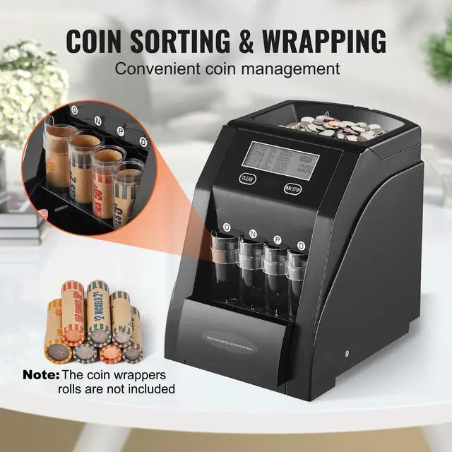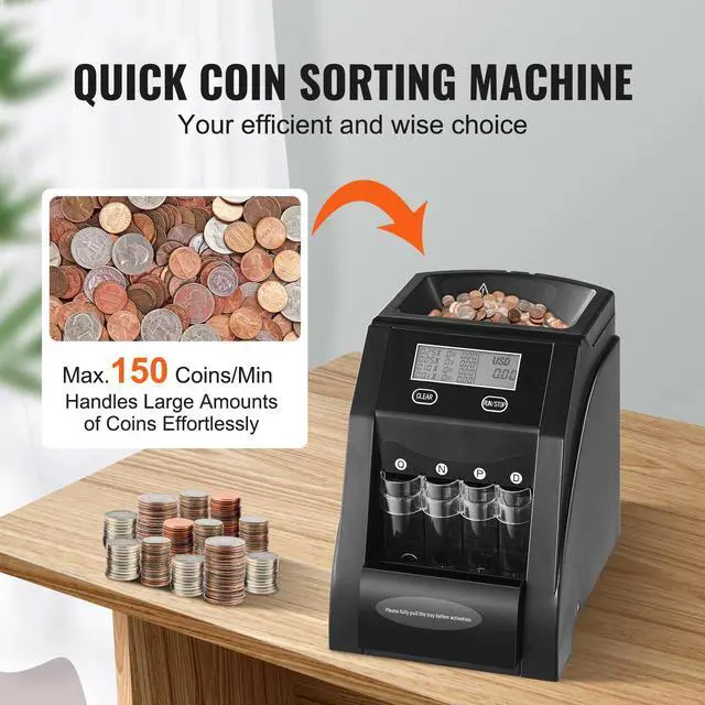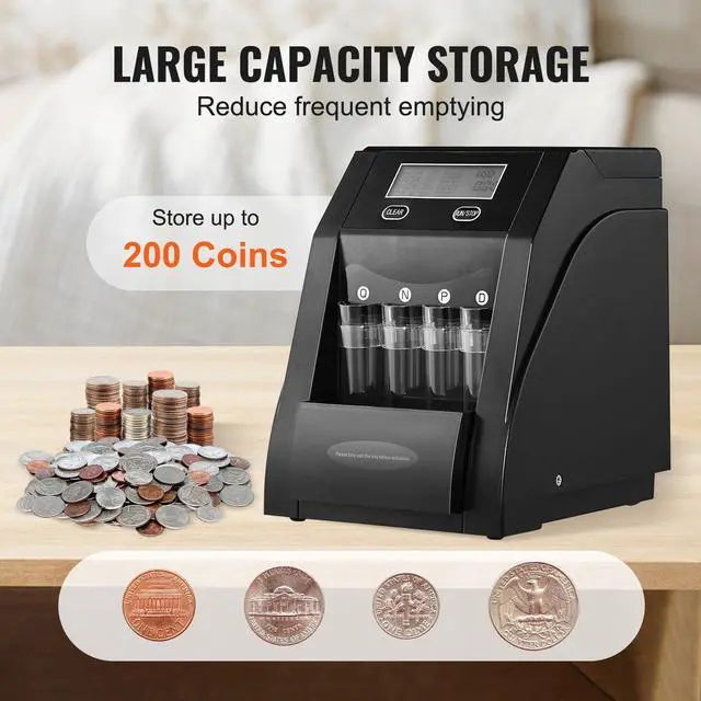 VEVOR USD Coin Sorter with LCD Screen Display Holds up to 200 Coins 4 Coin Tubes