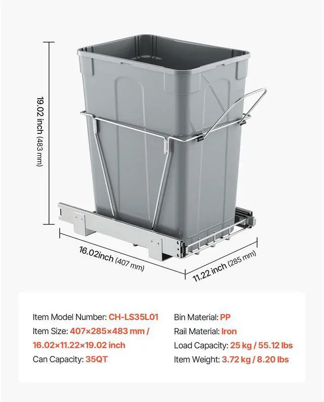 Bin Material: PP,Item Size: 407x285x483 mm / 16.02x11.22x19.02 inch,Load Capacity: 30 kg / 66.14 lbs,Item Model Number: CH-LS35L01,Rail Material: Iron,Can Capacity: 35QT,Item Weight: 3.72 kg / 8.2 lbs