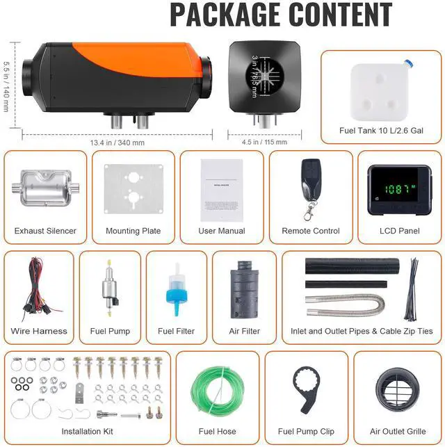 Fuel Consumption: 0.12-0.26 L/H,BTU: 108-161ft²/10-15 m²,Working Voltage: 12V & 24V,Fuel Tank Volume: 10 L/2.6 Gal,Control Method: LCD+Remote Control,Working Temperature: -40-104/-40-40,Applicable Altitude: Below 3000 m/9843 ft,Air Outlet Pipe Inner Diameter: 3 in/76.5 mm,Heating Power: 2KW,Adjustable Temperature Range: 46-96.8/8-36,Net Weight: 11 lbs/5 kg,Product Size: 13.4×4.5×5.5 inch/340×115×140 mm