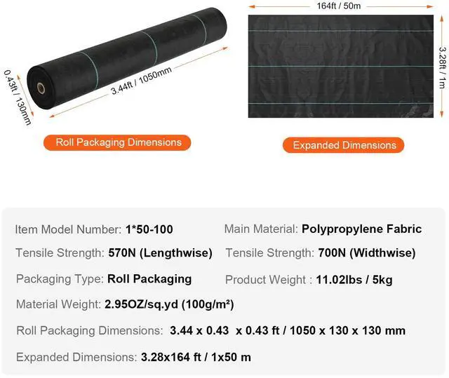 Tensile Strength: 570N (Lengthwise),Roll Packaging Dimensions: 3.44 x 0.43 x 0.43 ft/ 1050 x 130 x 130 mm,Packaging Type: Roll Packaging,Item Model Number: 1*50-100,Product Weight: 11.02 lbs / 5 kg,Expanded Dimensions: 3.28 x 164 ft / 1 x 50 m,Main Material: Polypropylene Fabric,Material Weight: 2.95OZ/sq.yd (100g/)