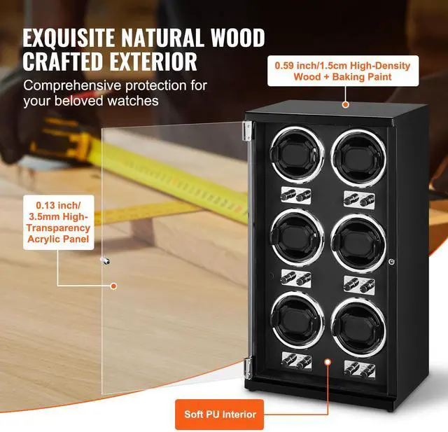 VEVOR Watch Winder, Watch Winder for 6 Men's and Women's Automatic Watches, with 6 Super Quiet Japanese Mabuchi Motors, Blue LED Light and Adapter, High-Density Board Shell and Black PU