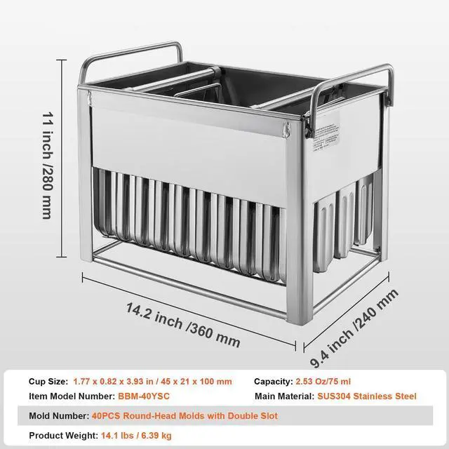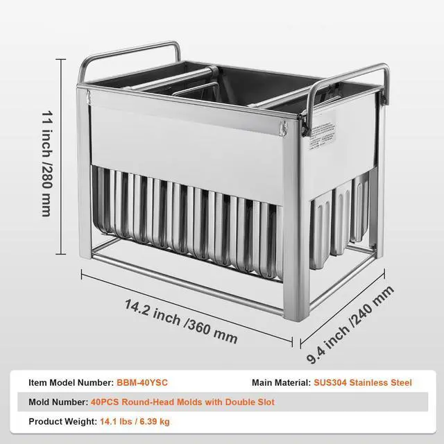 Item Model Number: BBM-40YSC,Product Weight: 14.1 lbs / 6.39 kg,Mould Number: 40PCS Round-Head Moulds with Double Slot,Main Material: SUS304 Stainless Steel