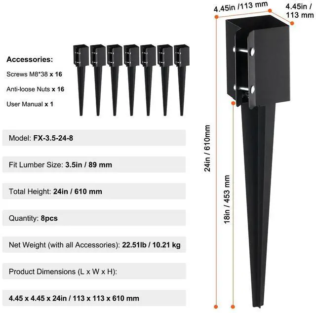 Model: FX-3.5-24-8,Fit Lumber Size: 3.5in / 89 mm,Quantity: 8pcs,Product Dimensions (L x W x H): 4.45x4.45x24in / 113x113x610 mm,Net Weight (with Accessories): 22.51lb / 10.21 kg,Nail Length: 18in / 453mm ±10mm,Material Thickness: Nail Board: 1.7mm, Column Fixing Plate: 1.7mm, ±0.1,Main Material: Steel,Total Height: 24in / 610 mm