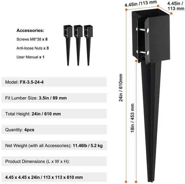 Model: FX-3.5-24-4,Fit Lumber Size: 3.5in / 89 mm,Quantity: 4pcs,Product Dimensions (L x W x H): 4.45x4.45x24in / 113x113x610 mm,Net Weight (with Accessories): 11.46lb / 5.2 kg,Nail Length: 18in / 453mm ±10mm,Material Thickness: Nail Board: 1.7mm, Column Fixing Plate: 1.7mm, ±0.1,Main Material: Steel,Total Height: 24in / 610 mm
