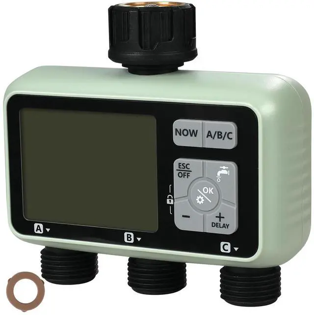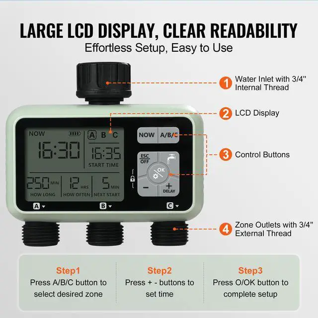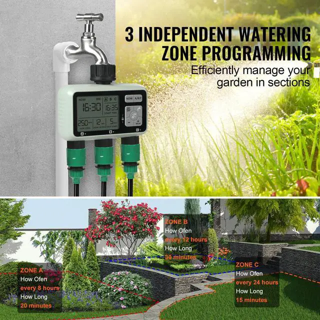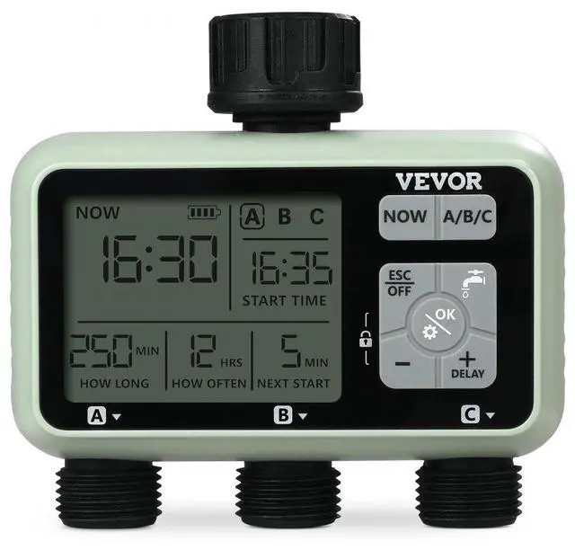 VEVOR Water Timer, 3 Outlets, Hose Watering Sprinkler Timer, with 3 Independent Watering Zone LCD Display Rain Delay Mode Manual Mode 360° Brass Inlet Metal Filter, IPX6 Waterproof for Yard Watering