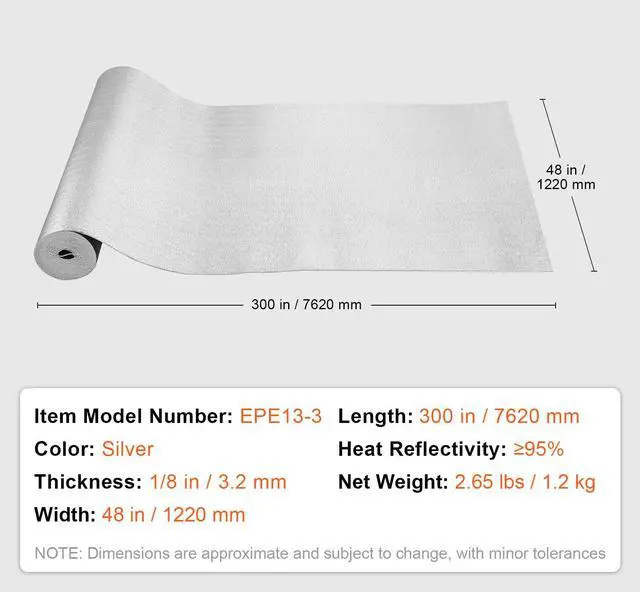 Thickness: 1/8 in / 3.2 mm,Length: 25 ft / 7620 mm,Color: Silver,Item Model Number: EPE13-3,Width: 48 in / 1220 mm,Net Weight: 2.65 lbs / 1.2 kg,Heat Reflectivity: 95%