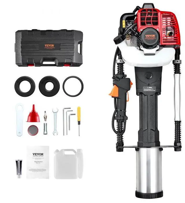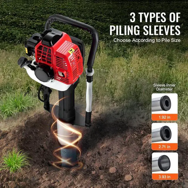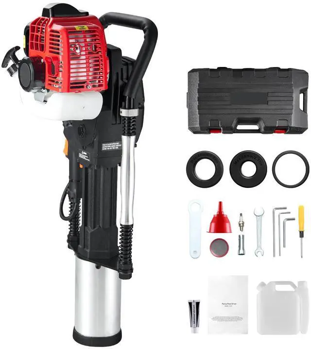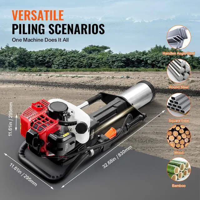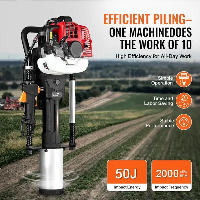 Engine Type: 2-Stroke,Main Materials: Die-cast Aluminum + Steel + Plastic,Rated Speed: 7000 RPM,Included Piling Sleeve Diameters: 49mm, 69mm, 100mm,Impact Energy: 50J,Item Model Number: JH-95,Fuel Tank Capacity: 1L,Rated Power: 1.3kW,Impact Frequency: 1300-1700 BPM,Product Dimensions: 295 × 295 × 830 mm / 11.61 × 11.61 × 32.68 in,Net Weight: 30.4 kg / 67.02 lbs,Displacement: 51.7cc