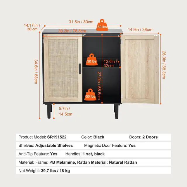 Support Foot Dimensions: 5.7 x 1.4 in / 145 x 35 mm,Anti-Tip Feature: Yes,Color: Black,Door Dimensions: 26.9 x 1.6 in / 683 x 40 mm,Shelf: 30 lbs / 13.6 kg,Handles: 1 Set, Black,Material: Frame: PB Melamine, Rattan Material: Natural Rattan,Product Dimensions: 31.5 x 14.8 x 34.6 in / 800 x 375 x 880 mm,Weight Capacity:,Shelf Dimensions: 24.3 x 14.0 in / 617 x 356 mm,Bottom Panel: 50 lbs / 22.7 kg,Doors: 2 Doors,Shelves: Adjustable Shelves,Item Model Number: SR191522,Top Panel: 50 lbs / 22.7 kg,Magnetic Door Feature: Yes,Net Weight: 39.7 lbs / 18 kg