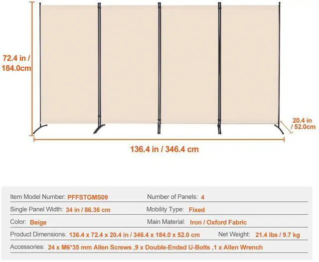 Mobility Type: Fixed,Single Panel Width: 34 in / 863.6 mm,Number of Panels: 4,Color: Beige,Item Model Number: PFFSTGMS09,Product Dimensions: 136.4 x 72.4 x 20.4 in / 3464 x 1840 x 520 mm,Net Weight: 21.4 lbs / 9.7 kg,Main Material: Iron / Oxford Fabric