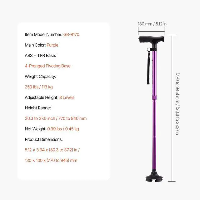 Main Color: Purple ,ABS + TPR Base: 4-Pronged Pivoting Base,Adjustable Height: 8 Levels,Weight Capacity: 250 lbs / 113 kg,Height Range: 30.3 to 37.0 inch / 770 to 940 mm,Item Model Number: GB-8170,Product Dimensions: 5.12 x 3.94 x (30.3 to 37.2) in / 130 x 100 x (770 to 945) mm,Net Weight: 0.99 lbs / 0.45 kg