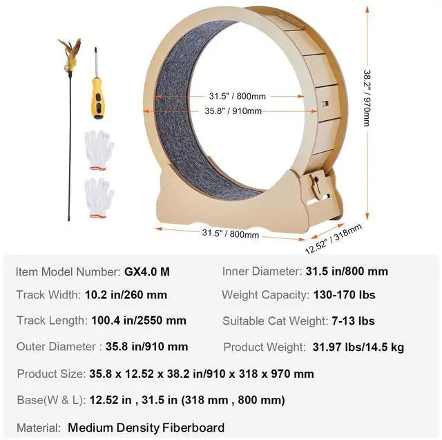 Outer Diameter: 35.8 in/910 mm,Base (W & L): 12.52 in (31.8 cm) x 31.5 in (80 cm),Track Width: 10.2 in/260 mm,Suitable Cat Weight: 7-13 lbs,Weight Capacity: 130-170 lbs,Product Size (L x W x H): 35.8 x 12.52 x 38.2 in (91 x 31.8 x 97 cm),Inner Diameter: 31.5 in/800 mm,Item Model Number: GX4.0 M,Material: Wooden board,Weight: 31.97 lbs (14.5 kg),Track Length: 100.4 in/2550 mm