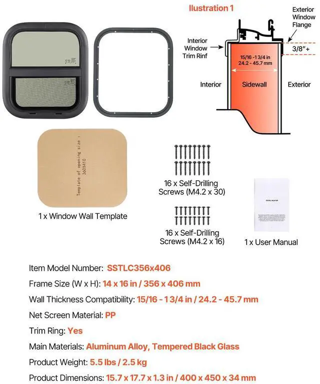 Net Screen Material: PP,Frame Size (W x H): 14 x 16 in / 356 x 406 mm,Main Materials: Aluminum Alloy, Tempered Black Glass,Item Model Number: SSTLC356x406,Product Weight: 5.5 lbs / 2.5 kg,Wall Thickness Compatibility: 15/16 - 1 3/4 in / 24.2 - 45.7 mm,Trim Ring: Yes,Product Dimensions: 15.7 x 17.7 x 1.3 in / 400 x 450 x 34 mm