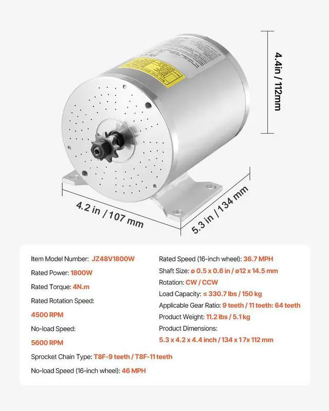 Applicable Gear Ratio: 9 teeth / 11 teeth: 64 teeth,No-load Rotation Speed: 5600 RPM,Load Capacity: 330.7 lbs / 150 kg,Noise: 70 dB,Rated Rotation Speed: 4500 RPM,Item Model Number: JZ48V1800W,Product Weight: 11.2 lbs / 5.1 kg,Rated Power: 1800W,Product Dimensions: 5.3 x 4.2 x 4.4 inch / 134 x 107 x 112 mm,Rated Torque: 4N·m,Rotation: CW/CCW