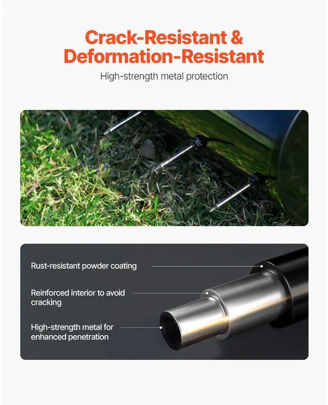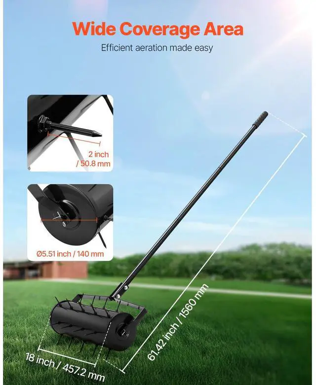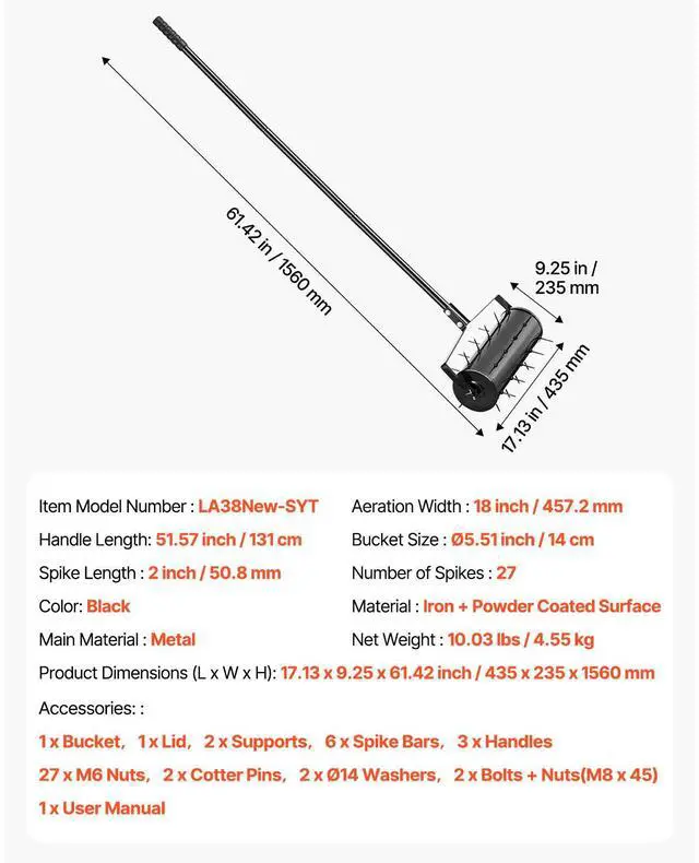 Handle Length: 51.57 inch / 131 cm,Spike Length: 2 inch / 50.8 mm,Color: Black,Item Model Number: LA38New-SYT,Aeration Width: 18 inch / 457.2 mm,Bucket Size: Ø5.51 inch / 14 cm,Number of Spikes: 27,Material: Iron + Powder Coated Surface,Product Dimensions (L x W x H): 17.13 x 9.25 x 61.42 inch / 435 x 235 x 1560 mm,Net Weight: 10.03 lbs / 4.55 kg,Main Material: Metal