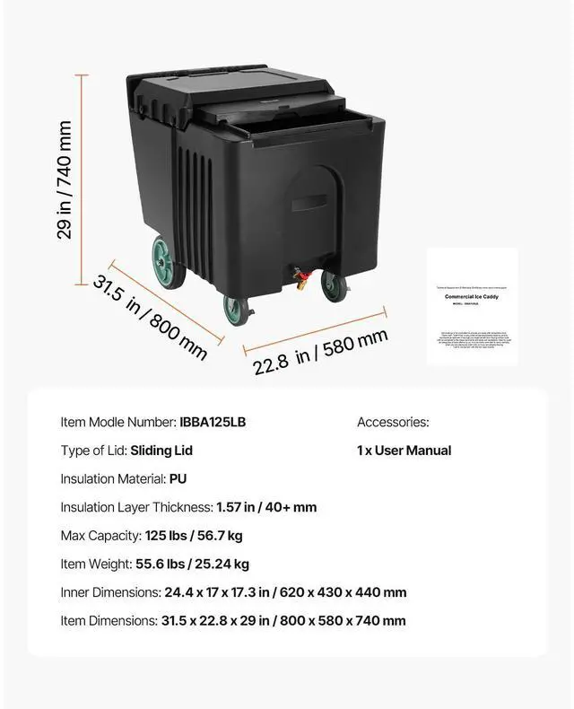 Insulation Material: PU,Insulation Layer Thickness: 0.8 in / 20 mm,Type of Lid: Sliding Lid,Inner Dimensions: 24.4 x 17 x 17.3 in / 620 x 430 x 440 mm,Max Capacity: 125 lbs / 56.7 kg,Item Model Number: IBBA125LB,Item Dimensions: 31.5 x 22.8 x 29 in / 800 x 580 x 740 mm,Item Weight: 55.6 lbs / 25.24 kg