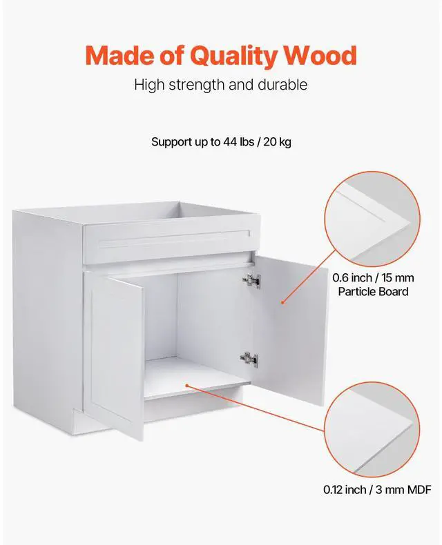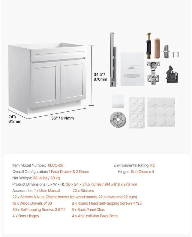 Hinges: Soft Close x 4,Environmental Rating: P2,Item Model Number: KLCC-06,Product Dimensions (L x W x H): 36 x 24 x 34.5 inches / 914 x 618 x 876 mm,Overall Structure: 1 Faux Drawer & 2 Doors,Net Weight: 66.14 lbs / 30 kg
