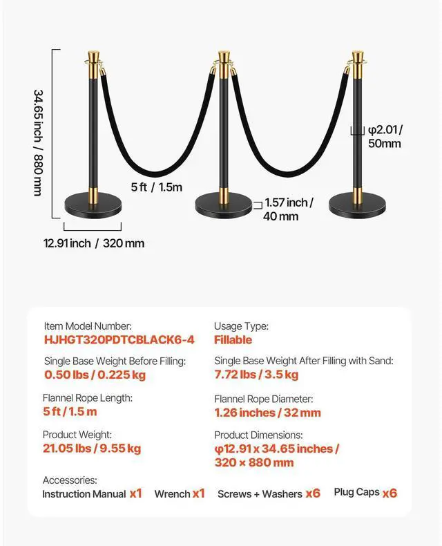 Usage Type: Fillable,Single Base Weight Before Filling: 0.50 lbs / 0.225 kg,Single Base Weight After Filling with Sand: 7.72 lbs / 3.5 kg,Item Model Number: HJHGT320PDTCBLACK6-4,Product Weight: 21.05 lbs / 9.55 kg,Flannel Rope Diameter: 1.26 inches / 32 mm,Product Dimensions: 12.91 x 35.04 inches / 320 x 890 mm,Flannel Rope Length: 4.92 ft / 1.5 m
