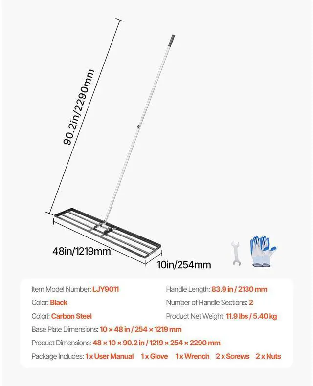 Handle Length: 83.9 in / 2130 mm,Base Plate Dimensions: 10 x 48 in / 254 x 1219 mm,Color: Black,Item Model Number: LJY9011,Product Net Weight: 11.9 lbs / 5.40 kg,Number of Handle Sections: 2,Product Dimensions: 48 x 10 x 90.2 in / 1219 x 254 x 2290 mm,Main Material: Carbon Steel