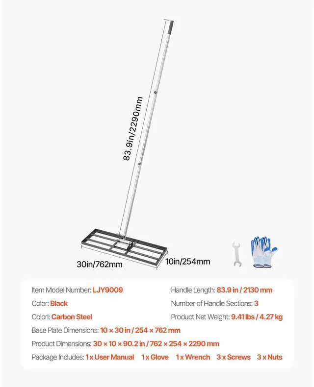 Handle Length: 83.9 in / 2130 mm,Base Plate Dimensions: 10 x 30 in / 254 x 762 mm,Color: Black,Item Model Number: LJY9009,Product Net Weight: 9.41 lbs / 4.27 kg,Number of Handle Sections: 3,Product Dimensions: 30 x 10 x 90.2 in / 762 x 254 x 2290 mm,Main Material: Carbon Steel