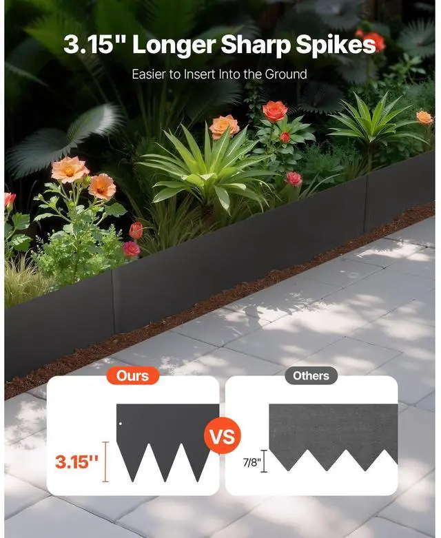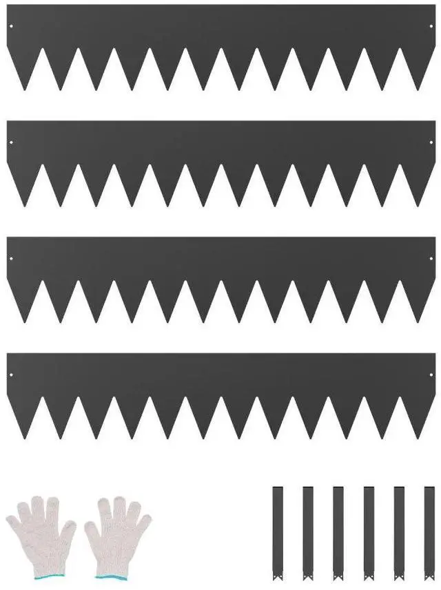 Surface Height: 4.84 in/ 123mm,Clips: 6 pcs, 1.5 x 10.24 in/ 38 x 260 mm,Number of Edgings: 4 pcs,Nails: Not included,Product Color: Black,Item Model Number: ZY-40X8-4Black,Product Weight: 19.73 lbs / 8.95 kg,Product Dimensions: 40 x 8 x 0.06 in/ 1016 x 203 x 1.5 mm,Spike Height: 3.15 in/ 80mm,Main Material: Galvanized Steel