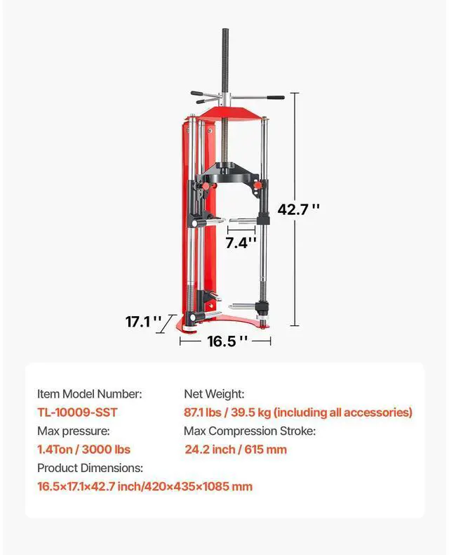 Item Model Number: TL-10009-SST,Product Dimensions: 16.5 x 17.1 x 42.7 in / 420 x 435 x 1085 mm,Net Weight: 87.1 lbs / 39.5 kg (including all accessories),Max Compression Stroke: 24.2 in / 615 mm,Max pressure: 1.4 Ton / 3000 lbs