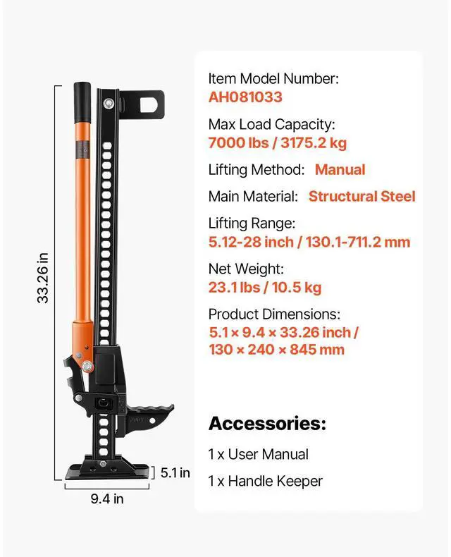 Item Model Number: AH081033,Max Load Capacity: 7000 lbs / 3175.2 kg,Lifting Method: Manual,Product Dimensions: 5.1 x 9.4 x 33.9 inch / 130 x 240 x 860 mm,Net Weight: 23.1 lbs / 10.5 kg,Main Material: Structural Steel,Lifting Range: 5.12-28 inch / 130.1-711.2 mm