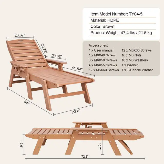 Product Dimensions (Backrest Adjusted to Highest): 72.0" × 28.54" × 36.61" / 1830 × 725 × 930 mm,Product Dimensions (Backrest Adjusted to Lowest): 72.0" × 28.54" × 19.69" / 1830 × 725 × 500 mm,Backrest Dimensions: 29.72" × 20.67" × 0.79" / 755 × 525 × 20 mm,Cup Holder Dimensions (Outer Dia x Inner Dia x Depth): 3.86" × 3.07" × 2.16" / 98 × 78 × 55 mm,Item Model Number: TY04-5,Product Weight: 47.40 lbs / 21.50 kg,Armrest Dimensions: 23.62" × 3.94" × 0.71" / 600 × 100 × 20 mm,Material: HDPE,Seat Dimensions: 41.54" × 20.67" × 0.79" / 1055 × 525 × 20 mm