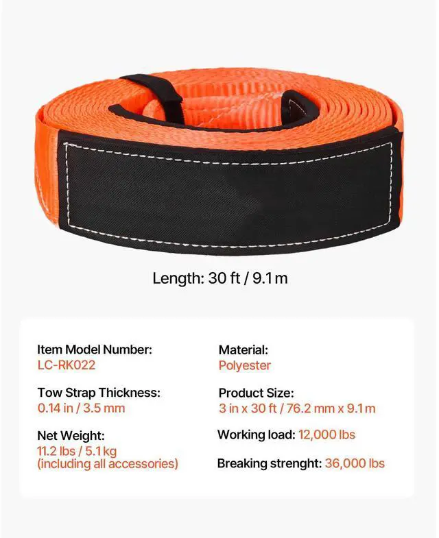 Tow Strap Thickness: 0.14 in/3.5 mm,Item Model Number: LC-RK02,Product Weight: 11.2 lbs / 5.1 kg,Material: Polyester,Tow Strap Breaking Strength: 36000 lbs/16329 kg,Product Size: 3 in x 30 ft / 76.2 mm x 9.1 m