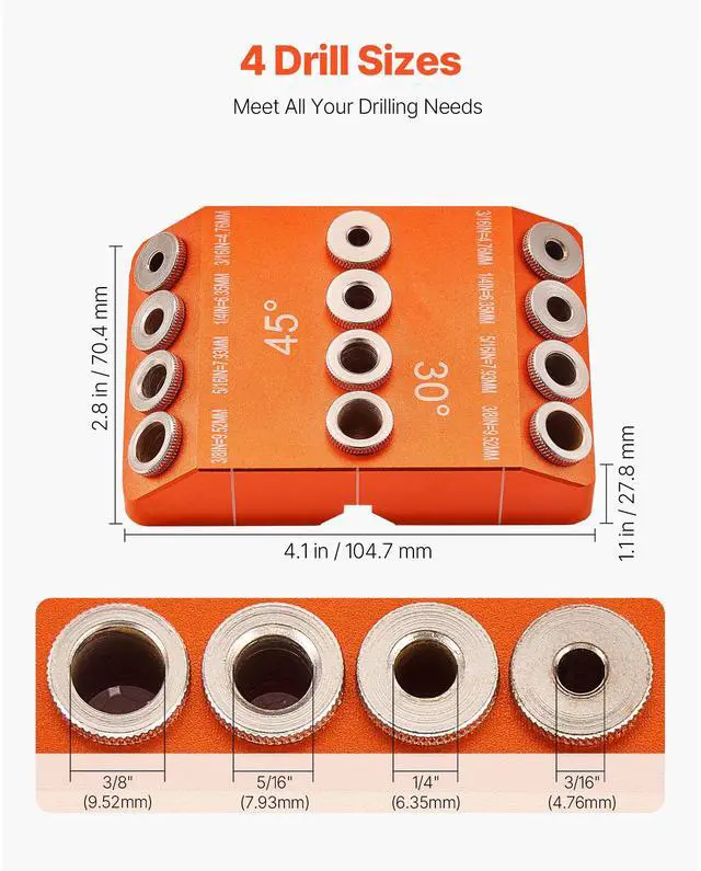 Drill Sleeves: 12 pcs (3/8" x3, 5/16" x3, 1/4" x3, 3/16" x3),Body Material: Aluminum Alloy,Dimensions (LxWxH): 2.8 x 4.1 x 1.1 in / 70.4 x 104.7 x 27.8 mm,Item Model Number: SSXR2505,Product Weight: 1.04 lbs / 0.47 kg,Drill Sizes: 3/8" (9.52mm), 5/16" (7.93mm), 1/4" (6.35mm), 3/16" (4.76mm),Multi-Angle Drilling: 30°, 45°, 90°
