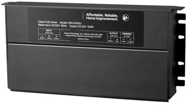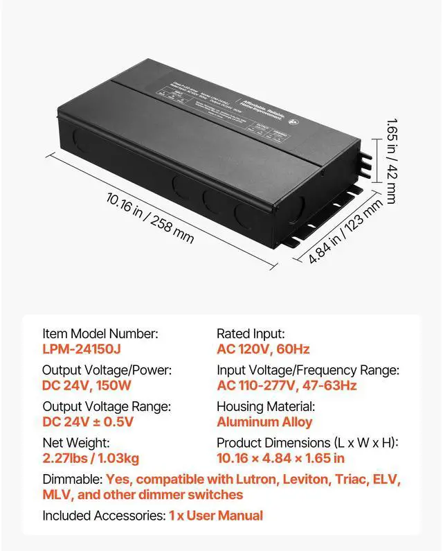 Output Voltage/Power: DC 24V, 150W,Dimmable: Yes, compatible with Lutron, Leviton, Triac, ELV, MLV, and other dimmer switches,Housing Material: Aluminum Alloy,Item Model Number: LPM-24150J,Input Voltage/Frequency Range: AC 110-277V, 47-63Hz,Output Voltage Range: DC 24V ± 0.5V,Rated Input: AC 120V, 60Hz