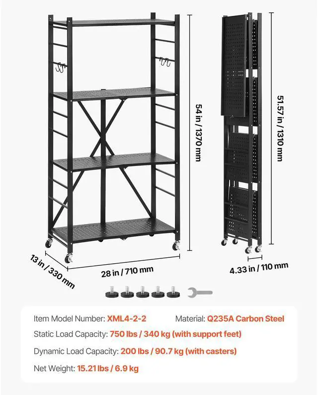 Static Load Capacity: 750 lbs / 340 kg (with support feet),Item Model Number: XML4-2-2,Dimensions: 13 x 28 x 54 in / 330 x 710 x 1370 mm (expanded with casters),Material: Q235A Carbon Steel,Dynamic Load Capacity: 200 lbs / 90.7 kg (with casters),Net Weight: 17.64 lbs / 8.0 kg