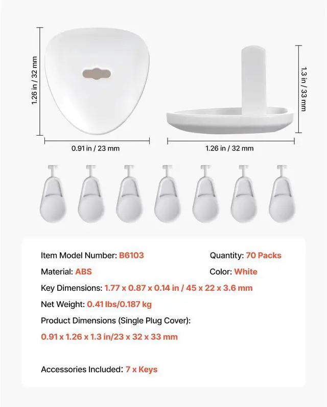 Key Dimensions: 1.77 x 0.87 x 0.14 in/45 x 22 x 3.6 mm,Color: White,Item Model Number: B6103,Quantity: 70 Packs,Material: ABS,Net Weight: 0.41 lbs/0.187 kg,Product Dimensions (Single Outlet Cover): 0.91 x 1.26 x 1.3 in/23 x 32 x 33 mm