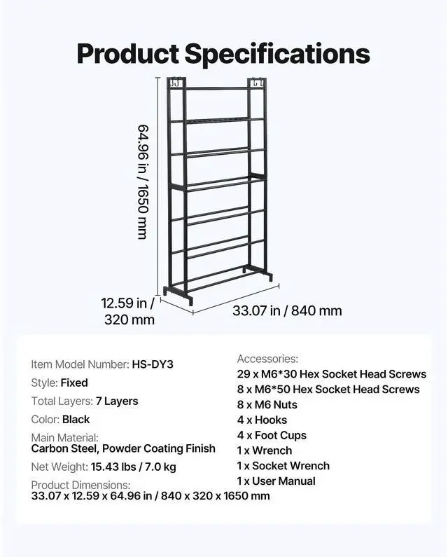 Total Layers: 7 Layers,Color: Black,Item Model Number: HS-DY3,Style: Fixed,Product Dimensions: 33.07 x 12.59 x 64.96 in / 840 x 320 x 1650 mm,Net Weight: 15.43 lbs / 7.0 kg,Main Material: Carbon Steel, Powder Coating Finish