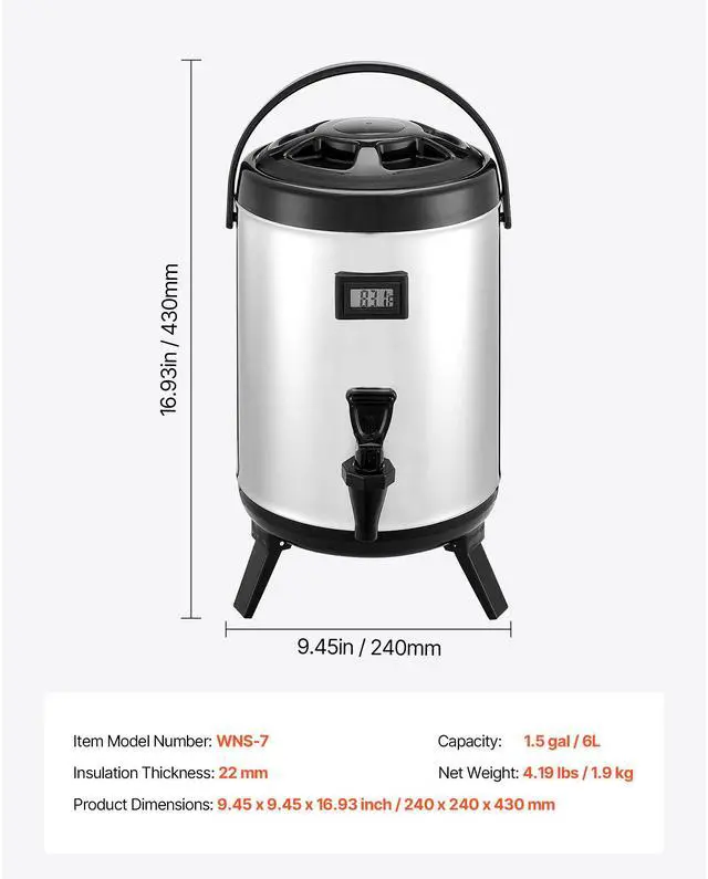 Capacity: 1.5 gal / 6L,Item Model Number: WNS-1,Insulation Thickness: 0.87 inch / 22 mm,Product Dimensions: 9.45 x 9.45 x 16.93 inch / 240 x 240 x 430 mm,Net Weight: 4.19 lbs / 1.9 kg