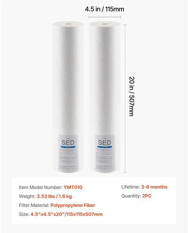 Lifetime: 4-6 Months,Item Model Number: YMT010,Filter Material: Polypropylene Fiber,Quantity: 2 PCS,Net Weight: 1.8 lbs / 0.8 kg x 2 pcs,Product Size: 4.5" x 4.5" x 20" / 115 x 115 x 507 mm